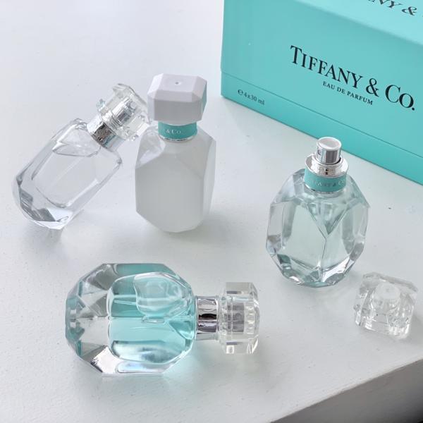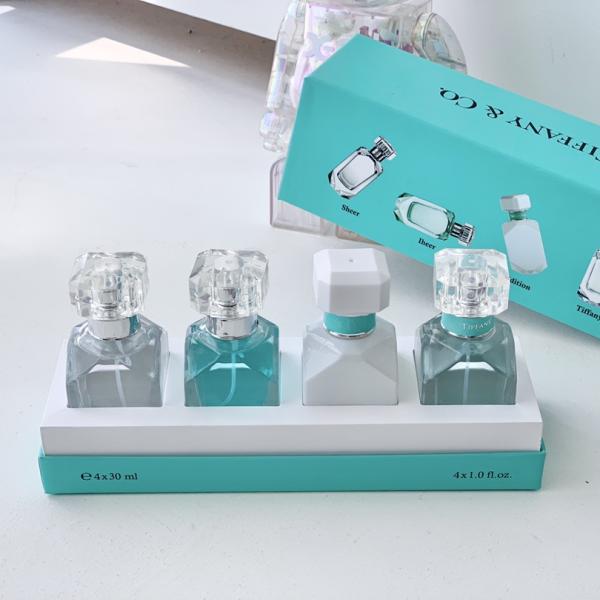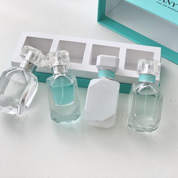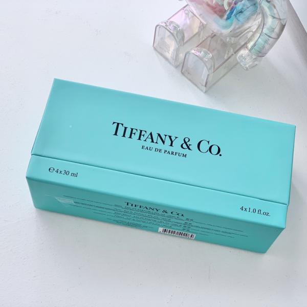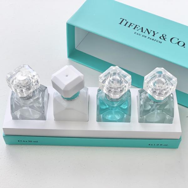 Tiffany four-piece fragrance set - A curated collection of four miniature fragrances showcasing Tiffany's iconic accords, blending floral, woody, and other sophisticated notes in an elegant package that embodies timeless elegance